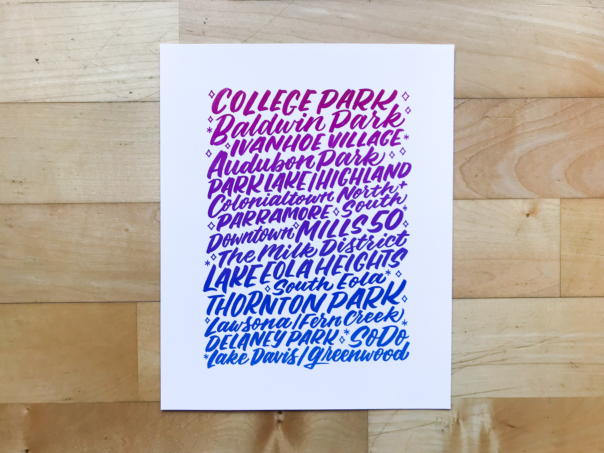 I immediately thought of Sean of Secret Society Goods and his freaky Florida style, and he was excited to collaborate. The outcome was a mixture of sign-painting-inspired words and a happy gator creeping beneath a Lake Eola swan on a stormy summer day.